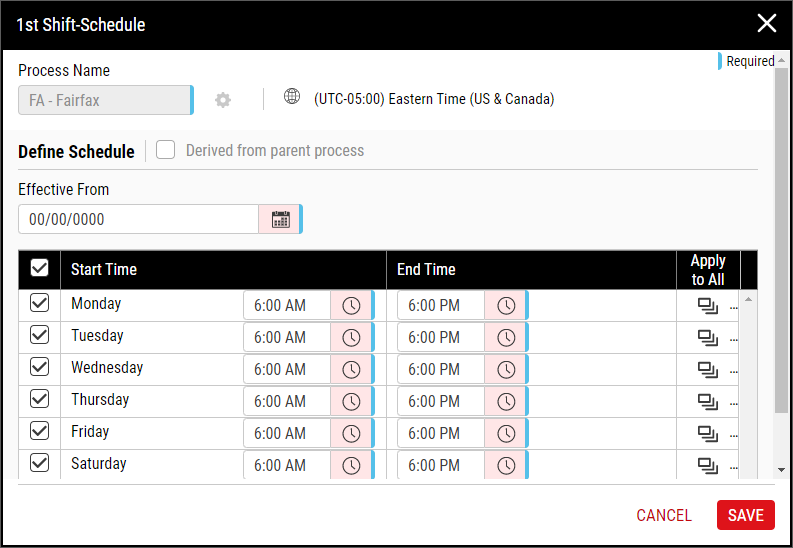 In the Process Shift Schedule section, you can configure the desired shift schedules, one per process. For more information, do the following: