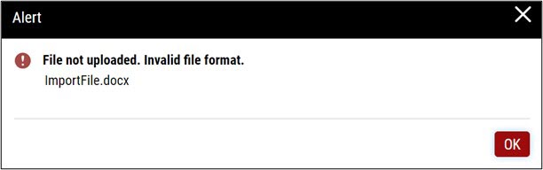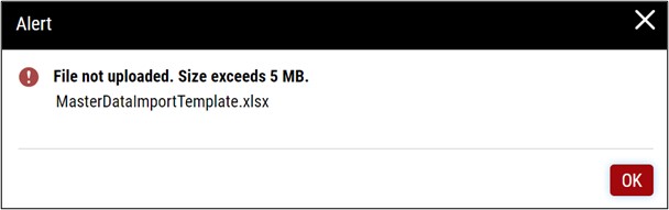 The supported file formats for master data import template are .xls and .xlsx. An error message is displayed if an unsupported file format is uploaded.