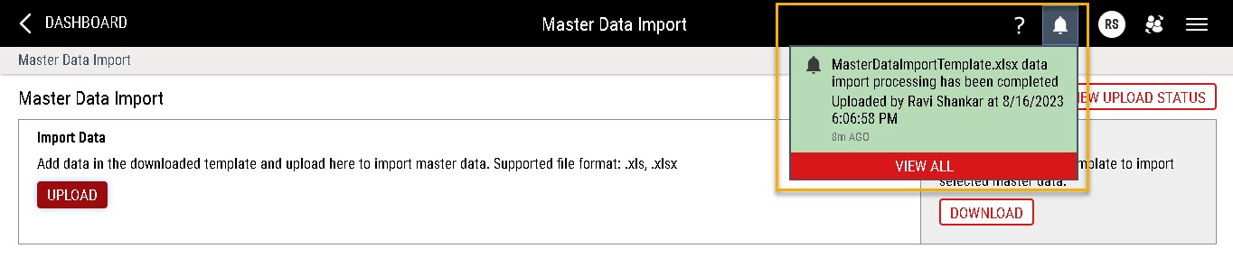 Click View All on the notification message to navigate to the Upload Status page and view the status of the upload.