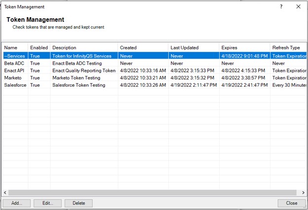 Once an access token has been retrieved from a host, it appears in the Access Token list on the Communications Source dialog.