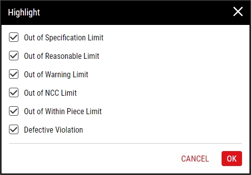 To highlight subgroup values that are outside of specific limits, select the desired violation. To hide a column, deselect the desired violation.