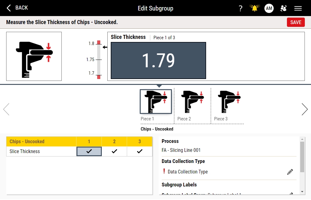 Select Save. After editing subgroup data, you can immediately view the edited subgroup values in the appropriate tiles on work dashboards and raw dashboards. Enact updates aggregated dashboards with edited subgroup values from the last six months on an hourly basis. Enact only records process events, including specification limit and control limit violations, when you first collect the subgroup data. When you edit previously collected subgroups and checklists, Enact will not generate new process events or remove existing process events.