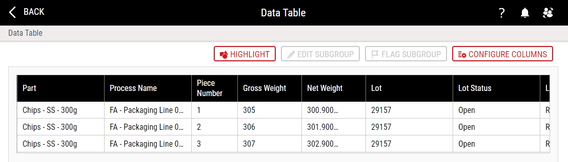 The Data Table displays values for the individual subgroup and can be opened from the Finished Item tile on the work dashboard or the Collected Data Pareto tile on the raw dashboard.