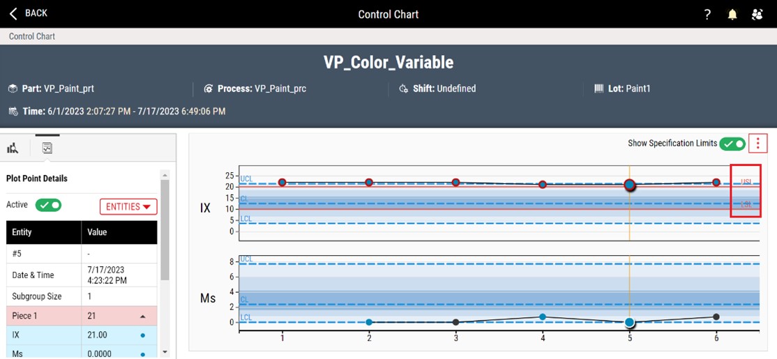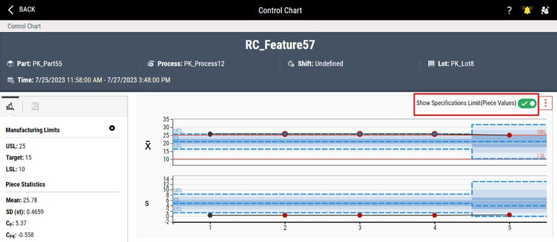 The appearance of the Show Specifications Limit (Piece Values) toggle on the control charts is controlled by the global setting Enable Control Chart USL/LSL display toggle. For more information, see Enabling Specifications Limit on Control Charts.