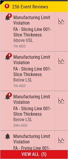 The Notifications tile displays the event notifications assigned to you, including missed data collections, manufacturing limit violations (net content control and specification limit) or statistical violations. For more information about notifications, please see Notification Rules.