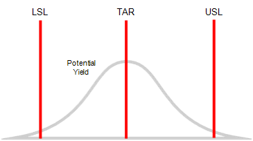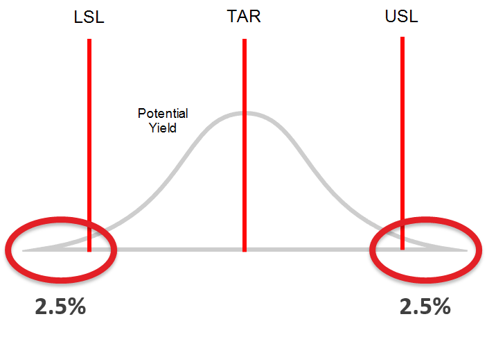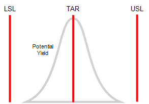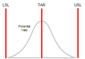 Represented by the letter grade (A, B, C), stream potential identifies the yield that your process could deliver in a best case scenario, using the current level of variability and perfectly centred on the target. For example, consider the following process with a potential yield of 95%.