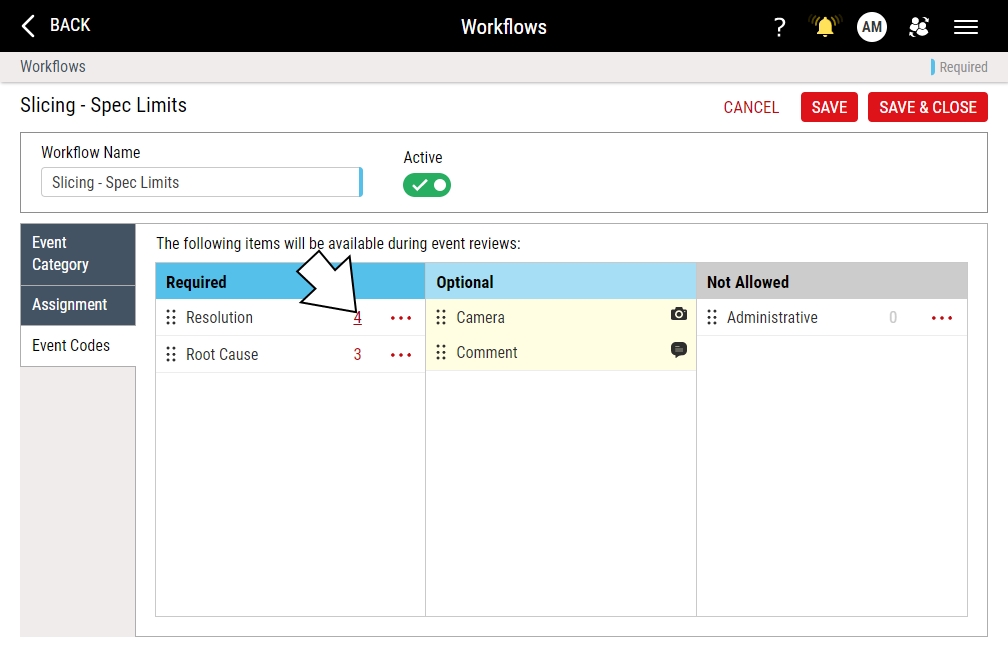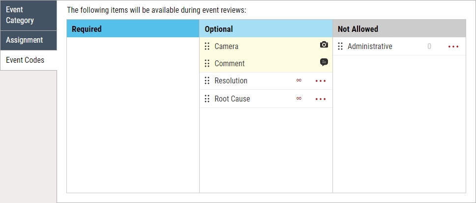 Under the Event Codes tab, you set the code types, event codes, comments and camera as Required, Optional or Not Allowed for this workflow.