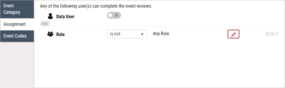 Under the Assignment tab, you will configure the recipients for event codes and comments responsibility, which could be any users within the selected role or the single user that owns the event. For example, you might select Data User and set the Quality Manager role as the recipient, which allows any user in the Quality Manager role to complete the event, as well as any user listed as the event owner to complete the event, regardless of role.