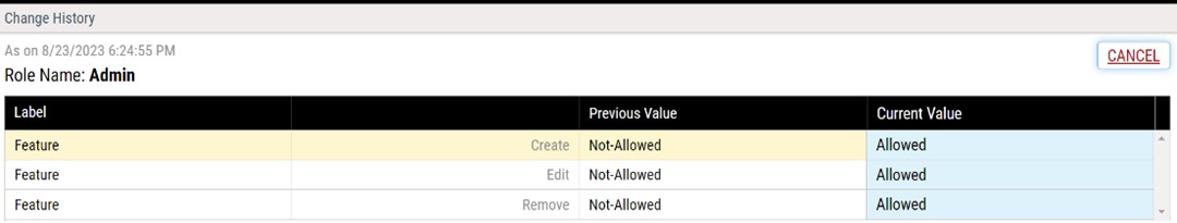 The Change History page is updated displaying a list of all changes made to the selected role.