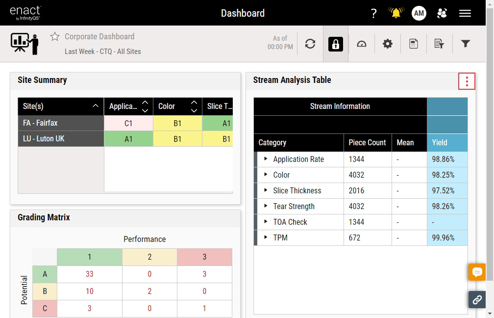 • Aggregated Dashboard. The layout and content of the aggregated dashboard is configurable, allowing you to select, place, and size individual aggregated data tiles, including the following tiles: Stream Analysis Table, 2D Chart, Grading Matrix, Site Summary, Bubble Chart, Stream Overview Report, Compliance Summary, Lot Report. For more information, please see Managing Dashboards.