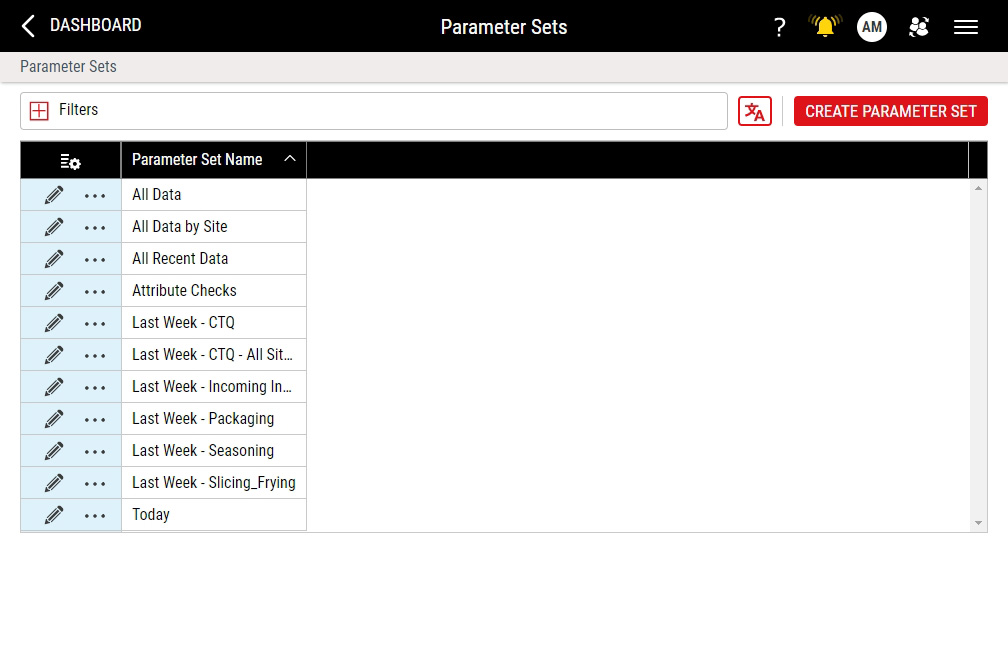 Parameter Sets are a selection of data defined by record count, time span, and one or more descriptor selection (part, process, feature, etc.), and applied to the tiles within a specific dashboard. For example, you could create a parameter set of the latest 1000 records from the last month where Process equals Sub-Assembly Station 001 and Feature equals Wheel Diameter. Though you have 50,000 records of data, which going back two years and includes the Assembly Station 001 process and the Body Length feature, Enact only returns the subset of data defined in your parameter set.