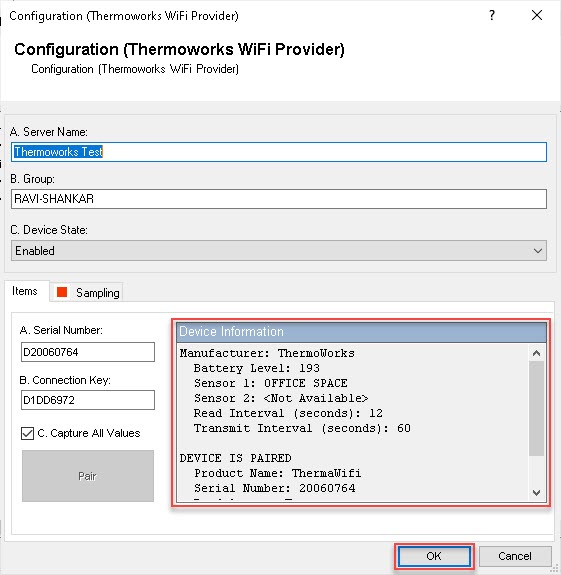 The Configuration (Thermoworks WiFi Provider) dialog appears.